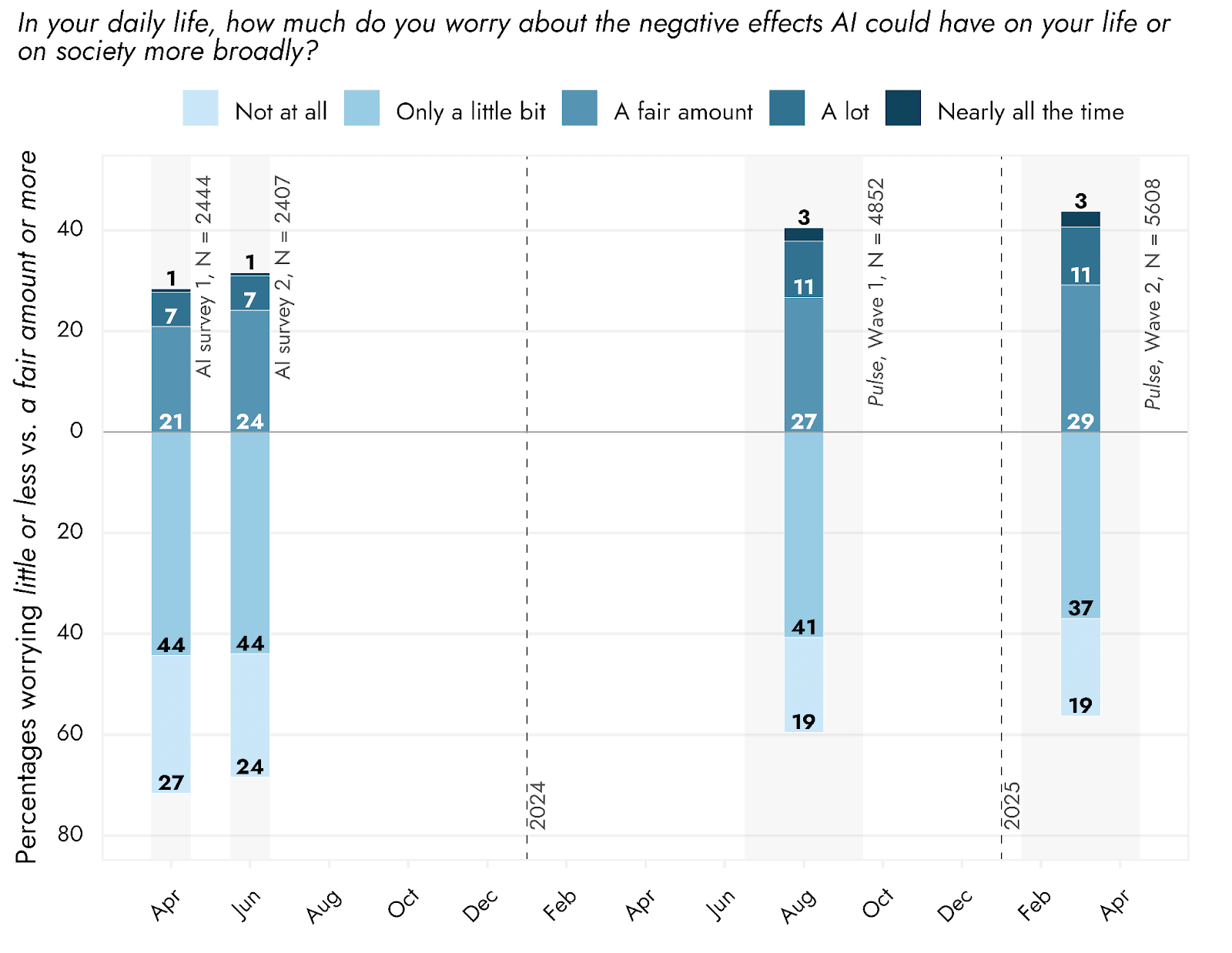 The increase in concern between 2024 and 2025 appears to be slowing. From 2024 to 2025, worry has only marginally increased: slightly fewer respondents said they worry “only a little bit” (dropping from 41% to 37%), while more reported worrying “a fair amount” (rising from 27% to 29%). This potential plateauing may reflect the normalization of AI tools in everyday life.