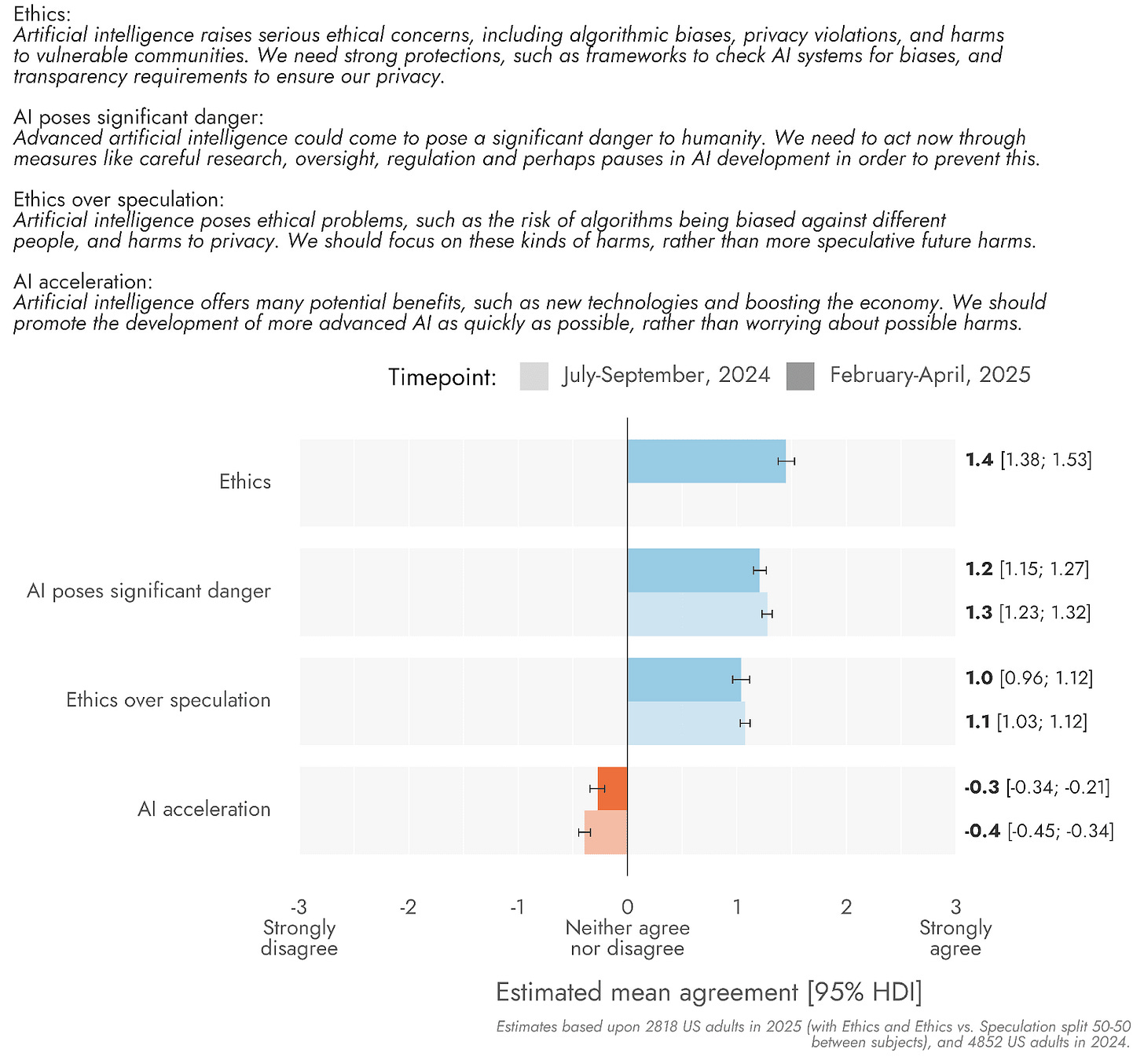 When we removed the comparative framing and simply asked about AI ethics, agreement with the statement increased, and there was even stronger correlation with concerns about more speculative harms.